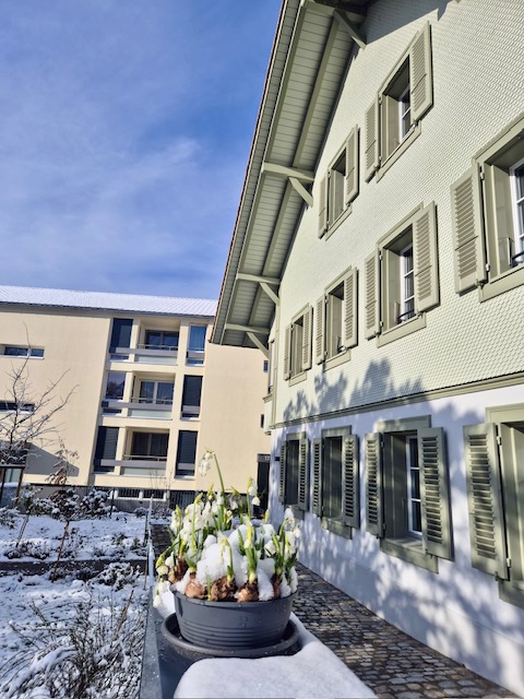 Am Abend traf eine Familie aus dem Spital ein und bezog das Wochenbett im Geburtshaus. Am nächsten Morgen konnten sie einen traumhaften Ausblick ins verschneite Winterwunderland geniessen. Voller Geborgenheit und Wärme genossen sie den Start in das neue Familienleben im heimeligen Geburtshaus.