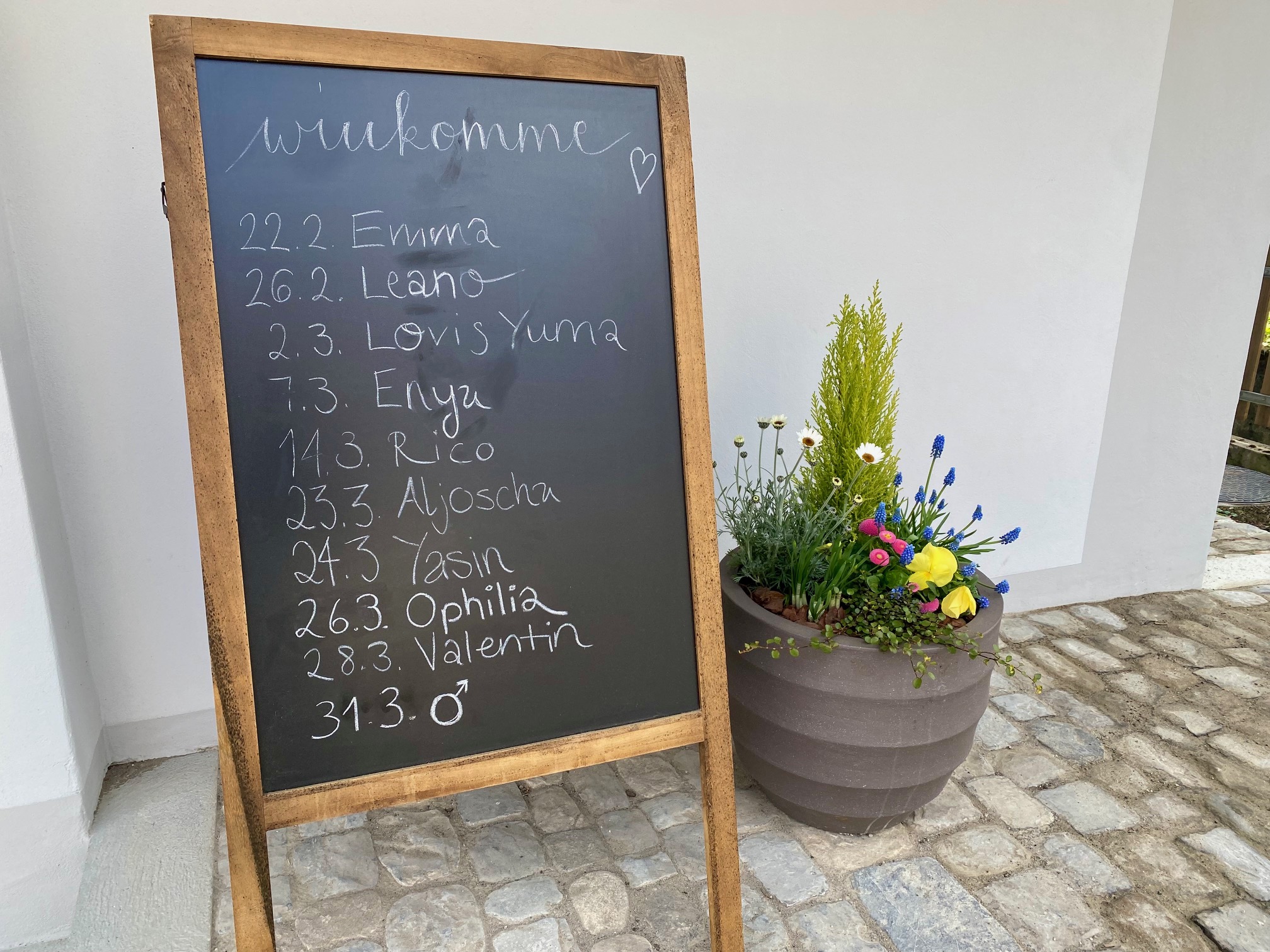 Der März ist wie im Flug vergangen – und wir durften zahlreiche neue Erdenbürger im Geburtshaus begrüssen. Unsere Tafel vor dem Haus füllte sich von Tag zu Tag mehr mit wunderschönen Namen - Lovis Yuma, Enya, Rico, Aljoscha, Yasin, Ophilia, Valentin. Der Frühling bringt nicht nur Sonnenstrahlen, sondern auch viel neues Leben, für das wir so dankbar sind.